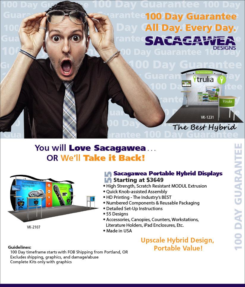 There's no other hybrid like the Sacagawea because no other portable hybrid combines value, design, and convenience into one very attractive portable display. Hybrid displays combine all the design benefits of more expensive exhibits, like sensuous curves, large format graphics, and flexible accessories, into a lightweight package that ships in a durable roto-molded case. The packaging is first class with individually number components and die-cut foam inserts so every part is protect it during shipping.